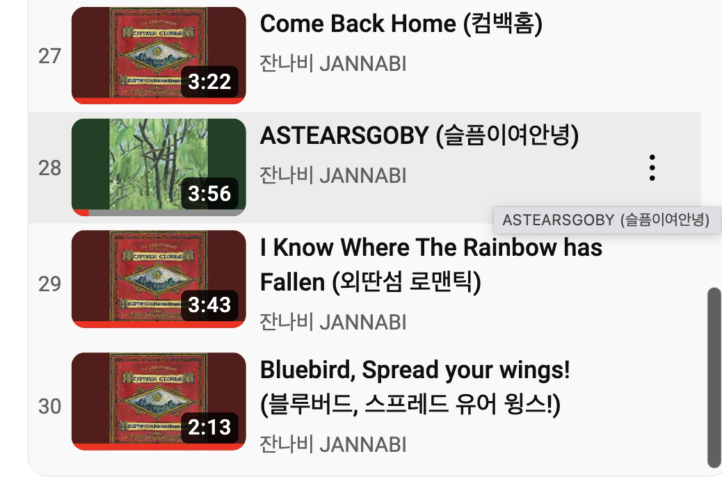 곡들을 하나의 시퀀스로 엮어 성장스토리마냥 보여준 연출이 좋았다. 생각보다 심오하고 철학적인 가사가 많다. 시간이 되면 가사집을 보며 노래를 듣거나, CD를 구매해서 순서대로 듣는 것도 너무 좋다.